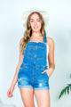 Denim Mini Short Overalls with Single Front Bib Pocket, Light Distressed Detail, Exposed Shorts Pockets and Cuffed Hem in Medium Blue (3397RK)